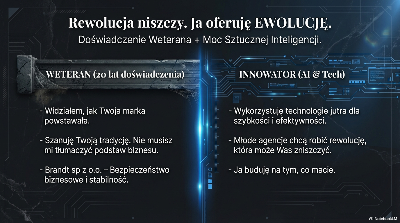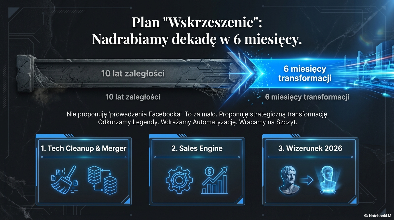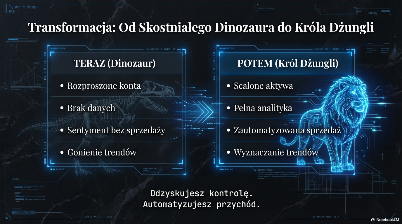 Plan ten zakłada wdrożenie zaawansowanej automatyzacji sprzedaży oraz wykorzystanie sztucznej inteligencji przy jednoczesnym zachowaniu autentycznego DNA firmy. Całość ukazuje ewolucję przedsiębiorstwa, które łączy wieloletnie doświadczenie z nowoczesnymi technologiami marketingu cyfrowego.